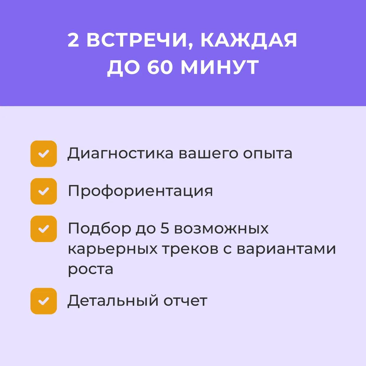 Услуга включает 2 встречи, каждая до 60 мин.